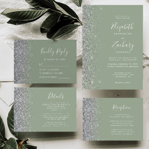 Silver Glitter Sage Green Script Wedding SuiteConçu par Akhates Designs