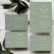 Le bord gauche de cet élégant mariage moderne, à l'exception de la carte de date, comporte une bordure en faux parties scintillant argent. Le texte personnalisable combine écriture manuscrite blanche, copperplate et polices italiques sur un arrière - plan vert sage. L'envers présente un design vert sauge et argent assorti.