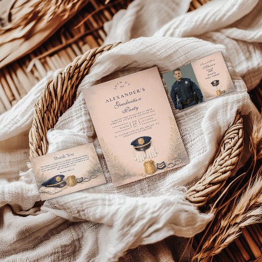 Celebrate a proud milestone with this elegant police academy graduation design, featuring a refined neutral palette, classic law enforcement details, and a formal ceremonial layout. Inspired by traditional graduation announcements, this design highlights service, achievement, and dedication with timeless style. Perfect for honoring a new police officer and sharing this meaningful accomplishment with family and friends.
