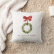 Een familienaam kerst worp kussen. Dit vakantiewerpkussen is voorzien van een eenvoudige buxushouten groene kerstkrans die aan een rode strik hangt. Alle tekst kan worden aangepast met elke formulering van uw keuze.