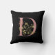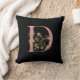 Fancy roze glitterletter D met gouden bladeren en zwenkoverlay en een coppery vlinder op zwarte achtergrond.