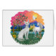 Een witte Devonshire Rex kat is de focus in dit ontwerp genaamd Fantasy Land dat een gouden kasteel op een heuvel door een kristalblauwe rivier, een magische eenhoorn, en een duif van vrede omvat.