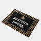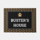 Een mat van een zwarte en witte hondenhuis met een faux gouden poepprintmonogram, een poepprintpatroon en de naam van je hond in grote witte letters.