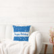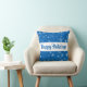 Festive Blue Snowflake Pattern Prettige feestdagen Sierkussen. Het ontwerp heeft witte sneeuwvlokken in verschillende vormen en maten op een blauwe achtergrond. U kunt de tekst wijzigen.