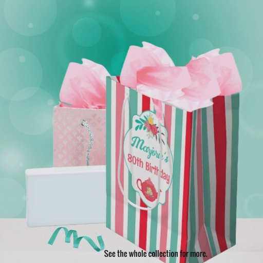 Ce papier d'emballage plat a un thème coloré d'anniversaire de fête du thé et est prêt pour vous à personnaliser avec votre propre texte. L'ensemble de trois feuilles de papier est coordonné en couleurs par bandes, pois et motifs de théière.