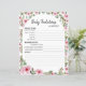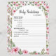 Papier avec le jeu "Baby Predictions & AVIS" pour le baby shower. La feuille de papier de jeu est décorée d'adorables roses d'aquarelle.