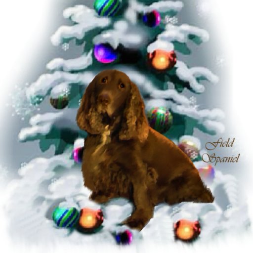 Prachtige kerstkunst met een schattige veldspaniël die voor een bosboom in het bos zit.