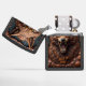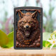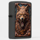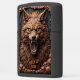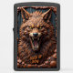 This lighter features a detailed, snarling brown wolf head carved in deep, high relief, showing aggressive bared teeth and glowing yellow eyes. The wolf is surrounded by a border of brown rocks and pebbles against a dark, textured background. The artwork is printed on a matte black lighter case. The design may look real due to the high detail and three-dimensional texture in the artwork.