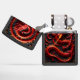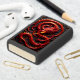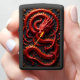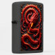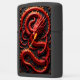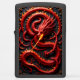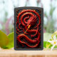 A magnificent red serpent dragon coils tightly into a circle, breathing a stream of intense golden fire. Its powerful form and razor scales are set against a dark, ornate background, wreathed in flame and glowing sparks, embodying untamed, primordial inferno power.
