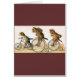 Schattige illustratie van twee katten en een puppy dat met rugzakjes op hun fietsen rijdt.
