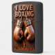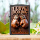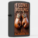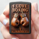 This lighter features a high-relief carving of a pair of brown leather boxing gloves hanging below the "I LOVE BOXING" text. The background shows an excited crowd and a small silhouette of a boxer raising their arms in victory. The gloves are laced and ideal for training or sparring. The overall artwork has a monochromatic brown tone. The design is set on a matte black lighter casing. The design may look real due to the high detail in the artwork.