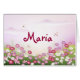 Joli design floral avec fleurs roses et blanches et libellules contre un ciel rose. Rose, vert, blanc. Customisez avec votre propre texte, redimensionnez l'image. Je me souviens d'une petite fille qui s'appelait María Flores et qui était l'une de mes dernières étudiantes de maternelle.mignonne, rétro, florale, vecteur, abstraite, motif, artistique, vintage, nature
