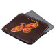 Een gloeiende, gevarieerde rog (Corvus corax) zaagt met vleugels op een donkere achtergrond. Voeg je eigen tekst toe.