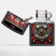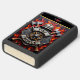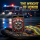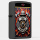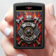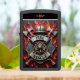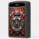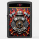 This personalized pocket lighter features a striking 3D-effect illustration of a firefighter emblem centered against a background of textured red flames. The central Maltese cross design includes banners reading FIRE and RESCUE, layered with two crossed wooden-handled fire axes and topped by a traditional fire helmet. At the top of the matte black case, the embossed text Smithright is rendered in a delicate white cursive script, positioned directly above a bold red letter W. A thin horizontal gold line separates the personalized name section from the main firefighter graphic. The entire artwork is framed by the sleek, dark border of the lighter metal.