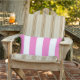 Cette coussin rayée rose et blanc présente une esthétique tendance de Palm Beach lorsqu'elle est associée à une motif en feuille tropicale.