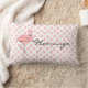 Un bel accent rose jette l'oreiller dans un motif à pois rose et blanc. Les graphiques d'un grand flamant rose et un Flamant rose de lecture de texte en script noir décorent les deux côtés du coussin. Personnalisez le texte pour lire ce que vous voulez. Un couvre-couette et des coques coussins sont disponibles.