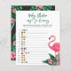 Het baby shower uitnodigingsontwerp heeft roze flamingo met weelderige groene bladschijfjes en tropische hibiscusbloemen. "Aloha Baby". Een tropisch bloemenpatroon met zwarte achtergrondkleur kleedt zich op de achterkant van de kaart.