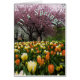 Une belle carte de voeux de ressort, apparence une série de tulipes oranges et jaunes sur une partie plus inférieure, et fleurir entièrement cerisiers roses et blancs sur le dessus. C'est ressort en parc !