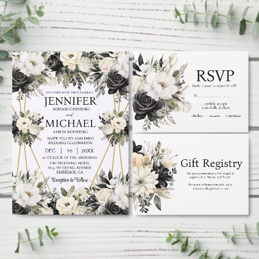 Fleurs florales noires et blanches Invitations de  (Devant / Derrière)