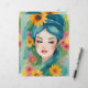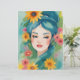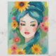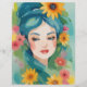 Dit levendige en grillige ontwerp toont een abstract portret van een vrouw met blauwgroen blauw haar versierd met kleurrijke bloemen. Haar serene expressie wordt geaccentueerd door gesloten ogen en rode lippen, waardoor ze een dromerige uitstraling krijgt. Rondom haar zijn levendige zonnebloemen, roze bloesems en een scala aan groen gebladerte, waardoor een weelderige, tuin-achtige sfeer ontstaat. Het stuk heeft een zachte, vectorachtige schilderstijl, waardoor het een modern maar romantisch gevoel krijgt. Het kleurenpalet wordt gedomineerd door tealen, geel, roze en groen, waardoor een harmonieuze en opvallende compositie ontstaat.