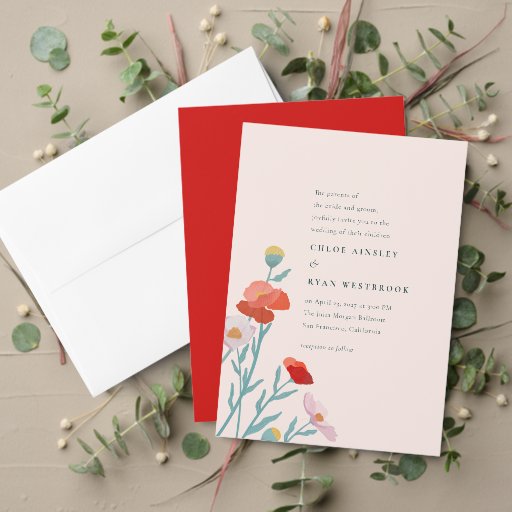 Deze bruiloft uitnodiging beschikt over handgeschilderde wilde bloemen, die een vleugje natuurlijke elegantie brengen aan een eenvoudig maar verfijnd ontwerp.