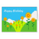 Een eenvoudig cartoon landschap met geometrische cartoon bloemen. Happy Birthday op de voor- en binnenzijde (tekst kan worden gewijzigd).