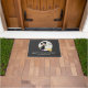 Halloween-themadoormat met Destei's originele cartoon illustratie van een schattig heks meisje dat op een broomstick vliegt voor de maan en drie vleermuizen. De heks heeft een zwarte outfit en een groot pet, haar haar is lichtgrijs en ze draagt paarse en grijze gestripte sokken. De achtergrondkleur is donkergrijs. Onder het afbeelding leest het "Happy Halloween!" samen met een personalizable tekstgebied voor een familienaam, bijvoorbeeld.