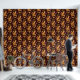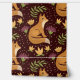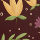 A charming pattern of seated orange foxes surrounded by yellow and purple flowers, green leaves, and dotted accents on a rich burgundy background.