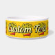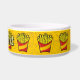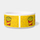 Cartoon illustratie van een klein pakje frietjes. Junk food outline iconen geel patroon achtergrond. Eigen Tekst.