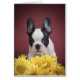 Frenchie - Chien français avec fleurs jaunes sur arrière - plan rouge