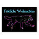 Een neonachtige afbeelding van een wolf op een zwarte achtergrond Geïnspireerd door de noordelijke lichten. "Frohliche Weihnachten" staat in gloeiend blauw en wit.
