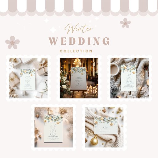 Een delicate slinger van gouden sterren en bevroren dennentakken hangt zachtjes aan de bovenkant, geaccentueerd door zacht blauw ornament en glinsterende kralen. Dit elegante winterbruiloftsontwerp roept de charme op van een rustige, verlichte vakantieavond - subtiel, romantisch en tijdloos.