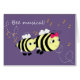 Schattige bijen-en-muziek-thema notitiekaarten op een paarse achtergrond. Binnen is leeg voor het toevoegen van uw eigen handgeschreven bericht. Kies notitie of wenskaart grootte. Beide worden geleverd met witte enveloppen.