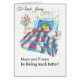 Een Get Well kaart om te personaliseren, met een groene kikker, liggend in bed met een warmwaterfles en medicijnen, druiven en bloemen rondom hem, van een handgeschilderde grillige illustratie van Judy Adamson.