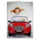 Blank wenskaart met het afbeelding van een meisje en haar puppy in een kleine rode cabriolet.