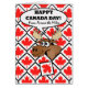 Een grappige molen breekt door een muur van paarse bladtegels op de cover van dit wenskaart op Canada Day. Gelukkig Canada Dag! Van over de Miles tekst op de omslag. Vet hedendaags ontwerp in rood, wit, zwart, en browns. Afbeelding en vers © Shoaff Ballanger Studios