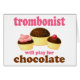 Dit humoristische trombonistische ontwerp heeft een trio van cupcakes en muziekslogan die zegt: Trombone - Will Play for Chocolate.