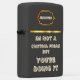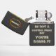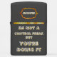 In een casual, luchtig moment, een hand cadeaus een strakke zwarte aansteker versierd met gouden letters. De humoristische zin I'm Not a Control Freak But You're Doing It Wrong valt prominent op en trekt de aandacht.