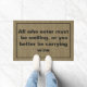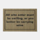 Grafische deurmat gemaakt in een grasmat, met een zwarte lijngrens, rond de rand. Vetzwarte tekst lezen Iedereen die binnenkomt moet glimlachen, of je kunt beter wijn dragen is volledig aangepast en kan gepersonaliseerd zijn om te lezen wat je wilt.