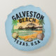 Decoratief rond kussen met een retro stijl vignet van de Galveston Beach, TX waterkant. Verkrijgbaar op een verscheidenheid aan kleding en accessoires.