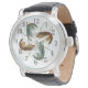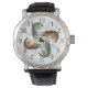 Horloge met vier garnalenontwerp op de wijzerplaat. Witte achtergrond en genummerd rondom in zwart, de garnalen zijn groen en bruin van kleur en hebben lange, kronkelende voelsprieten wat interesse toevoegt aan het ontwerp. Gemaakt als een herenhorloge, en is perfect voor een zoutwatervisser, of eigenaar van een aaswinkel, maar werkt ook voor vrouwen of kinderen.