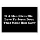 Hier is er een voor de homofobe fundie: "Als een man Jezus zijn liefde geeft, maakt dat hem homo?" Kijk hoe de religieuze moeraspijp probeert een manier te vinden om deze te beantwoorden. Een leuke manier om met hen te knoeien.