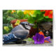Cette carte de note colorée comporte un geai bleu qui a débarqué sur une plate-forme de porche entourée par des fleurs. La coloration bleue, grise, blanche et noire de l'oiseau est placée par une émeute de couleur. Il y a une théière décorative avec des nasturces oranges et jaunes et un pétunia pourpre. Le feuille de vert accomplit ce kaléidoscope de couleurs.