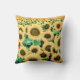 Gooi het kussen in een veld van goudgele zonnebloemen met chocoladebruine centra en groene bladeren