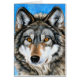 Een acrylschilderij van een grijze wolf boven een blauwe achtergrond.