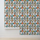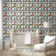 Voeg een pop kleur toe aan je wanden met dit fantastische retro mid century behang. Het heeft de heldere en gewaagde kleuren turquoise blauw, twee tinten sinaasappel, goud, tan en zwart.