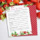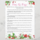 Een beszoete baby is onderweg! Dit baby shower "Pass the Prize" kaartspel bevat aardbeien, witte bloemen en groen. Het wordt aangevuld met een leuke handschriftstijl typografie en een zoete aardbeizaden achterkant. U kunt alle tekst- en afbeeldingsplaatdetails aanpassen aan uw specifieke behoeften. Neem contact op met de ontwerper voor eventuele bijpassende producten die niet beschikbaar zijn.