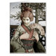 3D digitale weergave van een mooie geisha met traditionele kleding zittend in een paviljoen, blauwe lucht en kersenbloesem achtergrond, tekeneffect