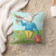 Kunst van kunstenaar Kristie Hubler, wit konijn dat blaast op wortelhoorn, gerbera daisy timepart klok met draaiend draaien, uit handen aan één kant van de kussen, gekke konijnen die uit theetheetheepot aan de andere kant opspringen