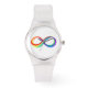 Helder symbool van oneindigheid uit kunststoflagen van rode, gele, groene, turquoise, blauwe en paarse verzadigde kleuren op witte achtergrond.